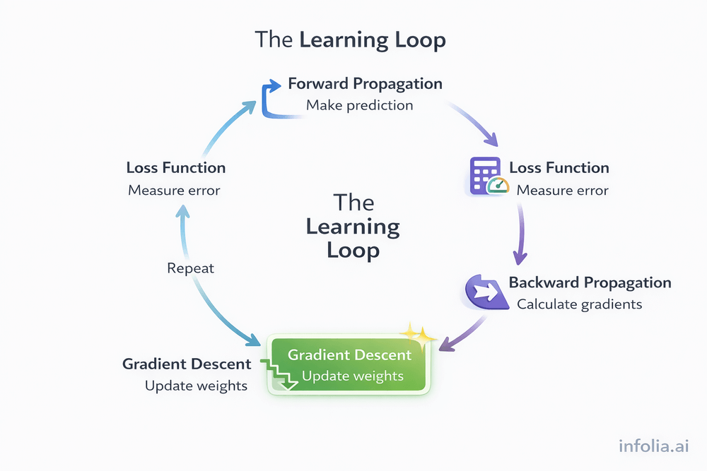This cycle continues until the loss converges. Gradient descent is what makes the learning loop functional.